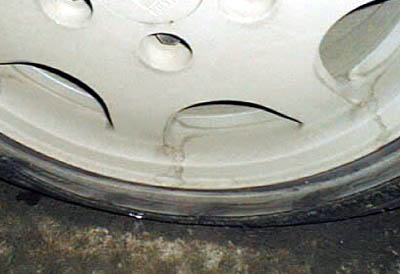 注入中にタイヤのサイドの部分から白いパンク修理剤が出ているのを発見!(゚゚;。たぶん2日前に雪の積もった道路の歩道縁石に乗り上げた時に損傷したんだと思います。その時はイヤな音がしたんですが、車体やホイルに損傷がないので安心していたのでした。