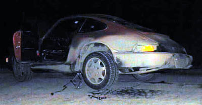 完全ではありませんが何とか少し持ち上がりました。でもサイドの損傷ならタイヤ交換が必要だろうし、第一このまま保つかどうかわかりません。964の場合スペアタイヤがスペースセーバータイヤのためガス入れが面倒です。何とか自宅まで保ってくれることを期待して慎重に走ることにしました。しかし・・・