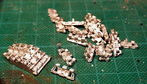 メタルパーツで武装して重量のあるIII号戦車になるので、履帯もフリウルのメタル製を調達した。キットにはモデルカステンの非可動式が付属しているが、現在のプラ製グンゼIII号のものよりは良くできている。購入したのは古いタイプのカシメ式のもので、組み立て自体はカステンの可動式よりも簡単だった。治具の上に載せて3箇所押しつけるだけだが、強く引っぱれば分解してしまうのかもしれない。